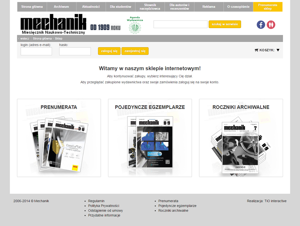 Sklep internetowy oparty o CMS TiOshop umożliwia zamówienie prenumeraty miesięcznika MECHANIK, zakup pojedynczych egzemplarzy oraz zakup roczników archiwalnych.